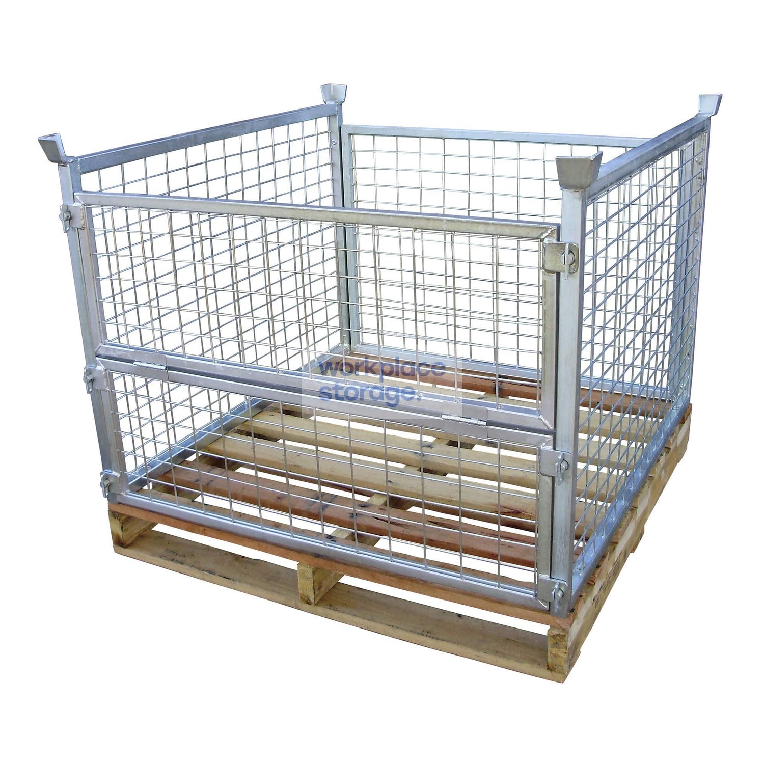 The full height Pallet Cage is designed for both general storage and assists in safe storage on pallet racking. These 800mm Pallet cages are both stackable and pallet rack safe. The front half fold down gate and rear swing gate are both fully removable, making these cages safe, easy and efficient. Easy Store Pallet Cages are available with steel sheet floors. These pallet cages are supplied standard with a heavy duty 8 board hardwood pallet.